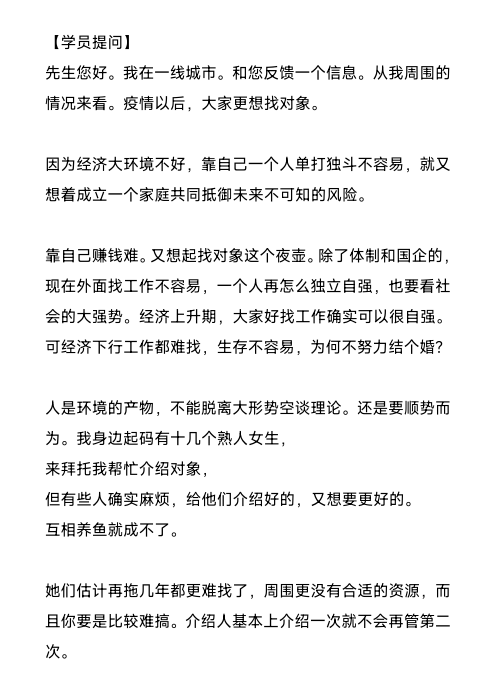 免责声明:本站大部分下载资源收集于网络,只做学习和交流使用,版权归原作者所有,请在下载后24小时之内自觉删除,若作商业用途,请购买正版,由于未及时购买和付费发生的侵权行为,与本站无关。本站发布的内容若侵犯到您的权益,请联系站长删除,我们将及时处理!:恋爱研习社 » 灏泽异谈更新疫情后的婚恋情况