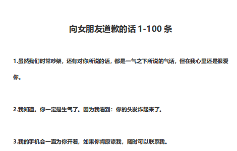 遇到问题请添加客服微信 免责声明:本站大部分下载资源收集于网络,只做学习和交流使用,版权归原作者所有,请在下载后24小时之内自觉删除,若作商业用途,请购买正版,由于未及时购买和付费发生的侵权行为,与本站无关。本站发布的内容若侵犯到您的权益,请联系站长删除,我们将及时处理!:恋爱研习社 » 《向女朋友道歉宝典》