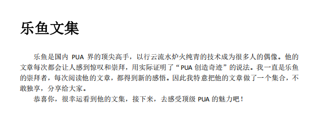 下载地址链接:https://pan.baidu.com/s/1hVhfOjbU4znylRjQjY1GAQ?pwd=tic8提取码:tic8 571 免责声明:本站大部分下载资源收集于网络,只做学习和交流使用,版权归原作者所有,请在下载后24小时之内自觉删除,若作商业用途,请购买正版,由于未及时购买和付费发生的侵权行为,与本站无关。本站发布的内容若侵犯到您的权益,请联系站长删除,我们将及时处理!:恋爱研习社 » 《乐鱼文集》