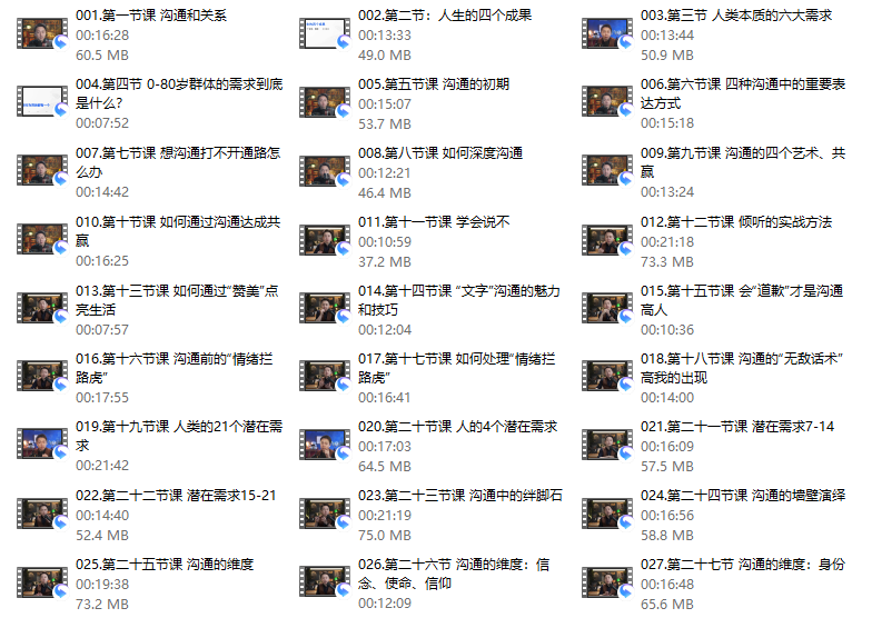 免责声明:本站大部分下载资源收集于网络,只做学习和交流使用,版权归原作者所有,请在下载后24小时之内自觉删除,若作商业用途,请购买正版,由于未及时购买和付费发生的侵权行为,与本站无关。本站发布的内容若侵犯到您的权益,请联系站长删除,我们将及时处理!:恋爱研习社 » 松明 高情商沟通新课27节