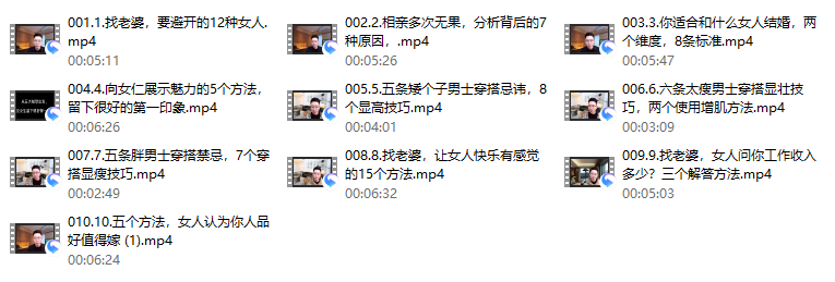 免责声明:本站大部分下载资源收集于网络,只做学习和交流使用,版权归原作者所有,请在下载后24小时之内自觉删除,若作商业用途,请购买正版,由于未及时购买和付费发生的侵权行为,与本站无关。本站发布的内容若侵犯到您的权益,请联系站长删除,我们将及时处理!:恋爱研习社 » 单身男人找老婆痛点课
