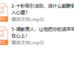 1下载地址 链接:https://pan.baidu.com/s/1cIIStfvP1lVixIozWfVbPw?pwd=2dcd 提取码:2dcd “舌尖诱导法”,让男人乖乖为你服务!.mp3 上床之后如何让男人对你念念不忘!.mp3 为了“性福”生活,必不可少的8个动作.mp3 学好这5招,你的性爱你做主!.mp3 有哪些让男人听了欲罢不能的调情甜话?.m...