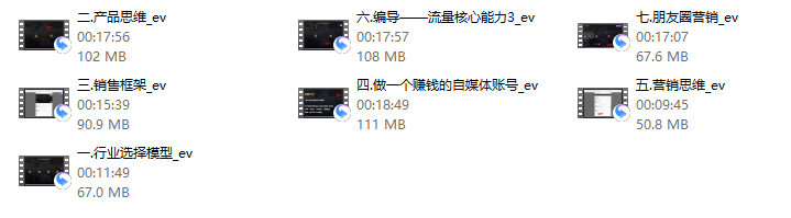 1下载地址链接:https://pan.baidu.com/s/11CPtviFjfKBLFTjPxX7UYw提取码:8bbj 一.行业选择模型_ev.mp4二.产品思维_ev.mp4三.销售框架_ev.mp4四.做一个赚钱的自媒体账号_ev.mp4五.营销思维_ev.mp4六.编导——流量核心能力3_ev.mp4七.朋友圈营销_ev.mp4